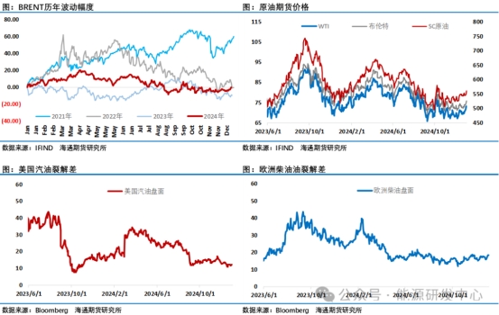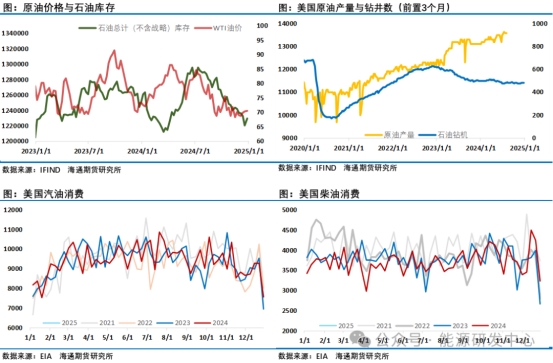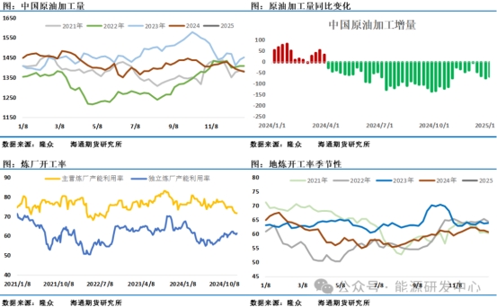 EIA周四公布的周度報(bào)告顯示,2024年最后一周因假期因素除卻戰(zhàn)略儲(chǔ)備的商業(yè)原油庫(kù)存減少117.8萬(wàn)桶至4.16億桶,降幅0.28%,而成品油庫(kù)存大幅增加,美國(guó)至12月27日當(dāng)周EIA精煉油庫(kù)存增加640.6萬(wàn)桶,汽油庫(kù)存增加 771.7萬(wàn)桶,精煉油庫(kù)存、汽油庫(kù)存增幅均錄得2024年1月5日當(dāng)周以來(lái)最大,導(dǎo)致庫(kù)存大增的原因是美國(guó)雙旦假期導(dǎo)致消費(fèi)季節(jié)性下滑,這種周期規(guī)律性變化并沒有給油價(jià)帶來(lái)壓力。中國(guó)市場(chǎng)方面整體需求仍舊缺乏亮點(diǎn),時(shí)間已經(jīng)進(jìn)入2025年,根據(jù)高頻數(shù)據(jù)跟蹤可以發(fā)現(xiàn)原油加工量繼續(xù)弱于去年同期,而成品油市場(chǎng)有累庫(kù)跡象,需求表現(xiàn)依舊疲弱,而根據(jù)多家機(jī)構(gòu)的分析,2025年中國(guó)汽柴油因新能源等替代消費(fèi)量仍將有1500萬(wàn)噸左右,這在2025年仍將是限制油價(jià)表現(xiàn)的重要利空因素。