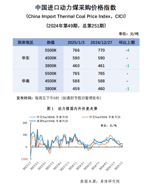 1月3日,5500K華東和華南進(jìn)口動力煤(0, -641.00, -100.00%)采購價分別為766/噸和765元/噸,分別較上期下滑4元/噸和持平,較國內(nèi)煤價低25-30元/噸;4500K華東和華南進(jìn)口動力煤采購價分別為590元/噸和588元/噸,均較上期持平,較國內(nèi)煤價低10-15元/噸;3800K華東和華南進(jìn)口動力煤采購價分別為460元/噸和459元/噸,均較上期下滑1元/噸,較國內(nèi)煤價低15-20元/噸。(理論測算,僅供參考)