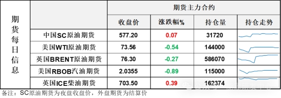 【1】WTI主力原油期貨收跌0.4美元,跌幅0.54%,報73.56美元/桶;布倫特主力原油期貨收跌0.21美元,跌幅0.27%,報76.3美元/桶;INE原油期貨收漲0.07%,報577.2元。