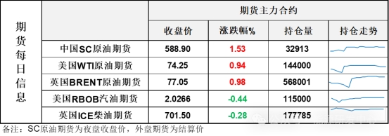 【1】WTI主力原油期貨收漲0.69美元,漲幅0.94%,報74.25美元/桶;布倫特主力原油期貨收漲0.75美元,漲幅0.98%,報77.05美元/桶;INE原油期貨收漲1.53%,報588.9元。