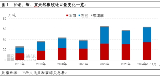 緬甸、老撾和柬埔寨為中國(guó)天然橡膠的主要進(jìn)口國(guó)家。海關(guān)總署公布數(shù)據(jù)顯示,2024年1-11月中國(guó)自緬甸進(jìn)口天然橡膠34.45萬(wàn)噸,同比增長(zhǎng)6.12萬(wàn)噸,漲幅21.6%,為歷史同期最高水平。2024年1-11月自老撾進(jìn)口天然橡膠28.74萬(wàn)噸,同比增長(zhǎng)7.1萬(wàn)噸,漲幅32.81%。同期自柬埔寨進(jìn)口天然橡膠1.46萬(wàn)噸,同比微增0.03萬(wàn)噸,漲幅2.1%。