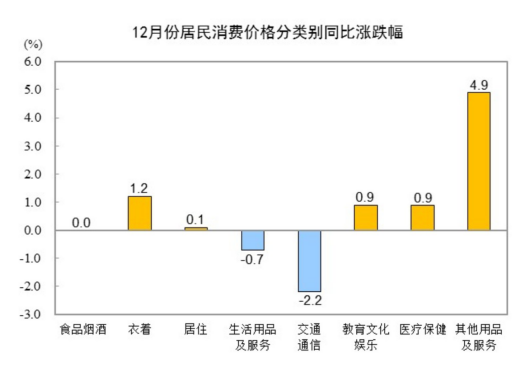 12月份,全國(guó)居民消費(fèi)價(jià)格環(huán)比持平。其中,城市持平,農(nóng)村下降0.1%;食品價(jià)格下降0.6%,非食品價(jià)格上漲0.1%;消費(fèi)品價(jià)格下降0.1%,服務(wù)價(jià)格上漲0.1%。