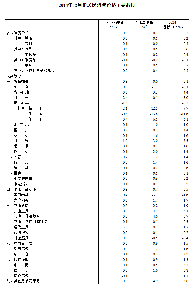 2024年12月份,全國(guó)居民消費(fèi)價(jià)格同比上漲0.1%。其中,城市上漲0.1%,農(nóng)村持平;食品價(jià)格下降0.5%,非食品價(jià)格上漲0.2%;消費(fèi)品價(jià)格下降0.2%,服務(wù)價(jià)格上漲0.5%。