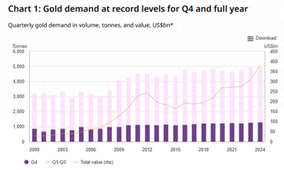 報告顯示,2024年第四季度包含場外交易(OTC)在內(nèi)的黃金總需求同比增長1%至1,297.4噸,全年總需求也增長1%至4,974.5噸,分別創(chuàng)下了季度和年度的新高。
