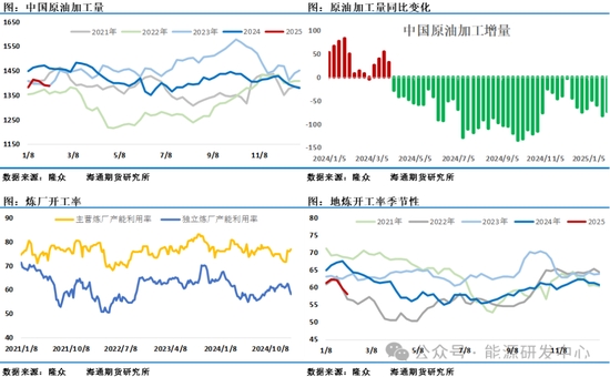 從原油市場供需層面來看,最新一期美國EIA原油庫存大幅累庫,后續(xù)原油進入季節(jié)性累庫階段,但全口徑庫存整體低于去年同期,庫存壓力不大。需求層面美國柴油消費數(shù)據(jù)受前期寒潮提振明顯高于去年同期,汽油消費一般但接下來將進入季節(jié)性回升階段。中國市場則在春節(jié)過后汽油消費回落,柴油后續(xù)將有所提升,但從原油加工量來看,中國原油加工量明顯低于去年同期,尤其是受原料供應影響的地方煉廠加工量下降明顯。