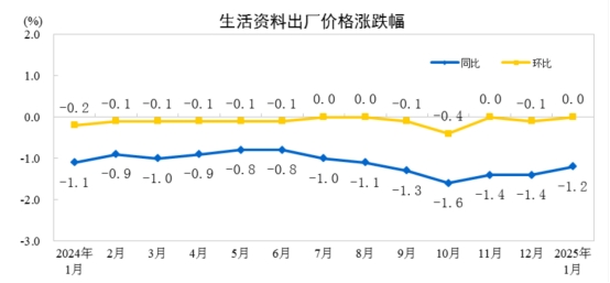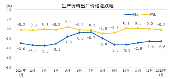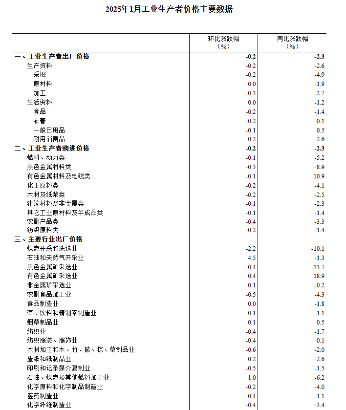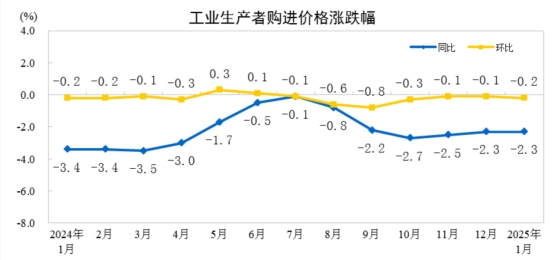 2025年1月份,全國工業(yè)生產(chǎn)者出廠價格和購進(jìn)價格同比均下降2.3%,降幅均與上月相同;環(huán)比均下降0.2%。