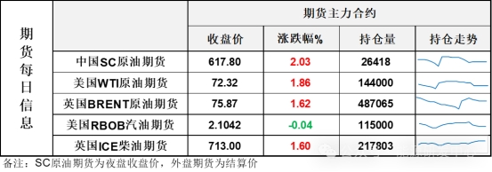【1】WTI主力原油期貨收漲1.32美元,漲幅1.86%,報(bào)72.32美元/桶;布倫特主力原油期貨收漲1.21美元,漲幅1.62%,報(bào)75.87美元/桶;INE原油期貨收漲2.03%,報(bào)617.8元。