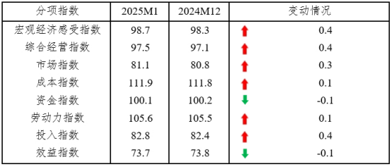 發(fā)展預(yù)期向好。1月份,反映企業(yè)預(yù)期的宏觀經(jīng)濟(jì)感受指數(shù)為98.7,較上月上升0.4點(diǎn)。其中,宏觀形勢感受指數(shù)為103.3,比上月上升0.3點(diǎn),行業(yè)形勢感受指數(shù)為94.0,比上月上升0.3點(diǎn)。信心預(yù)期有所提振。