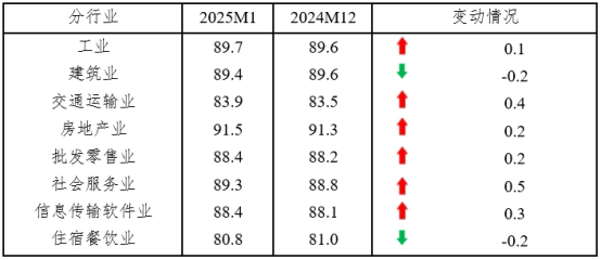 分行業(yè)指數(shù)6升2降。如下表所示,1月份,工業(yè)、交通運(yùn)輸業(yè)、房地產(chǎn)業(yè)、批發(fā)零售業(yè)、社會(huì)服務(wù)業(yè)、信息傳輸軟件業(yè)指數(shù)由降轉(zhuǎn)升,較上月分別上升0.1、0.4、0.2、0.2、0.5和0.3點(diǎn)。建筑業(yè)、住宿餐飲業(yè)指數(shù)繼續(xù)下降,較上月各下降0.2點(diǎn)。行業(yè)運(yùn)行穩(wěn)中向好。