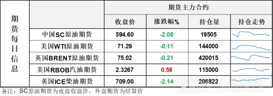 【1】WTI主力原油期貨收跌0.08美元,跌幅0.11%,報(bào)71.29美元/桶;布倫特主力原油期貨收跌0.16美元,跌幅0.21%,報(bào)75.02美元/桶;INE原油期貨收跌2.08%,報(bào)594.6元。