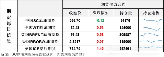 【1】WTI主力原油期貨收漲0.38美元,漲幅0.53%,報72.48美元/桶;布倫特主力原油期貨收漲0.44美元,漲幅0.58%,報76.48美元/桶;INE原油期貨收跌0.12%,報566.7元。