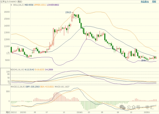 鄭棗主力CJ2505合約,周五收盤報(bào)9365元/噸,較上周期價(jià)上漲85元/噸,持倉(cāng)量131499手,較上周增加7842手。技術(shù)上,周線級(jí)別MACD紅色能量柱放量,KDJ指標(biāo)收斂,指標(biāo)于零軸下方上行。