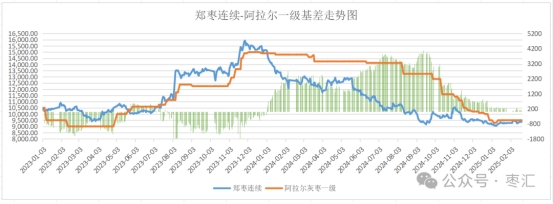 2月21日,阿拉爾灰棗一級(jí)與鄭棗期價(jià)基差為70元/噸,基差小幅走擴(kuò)。