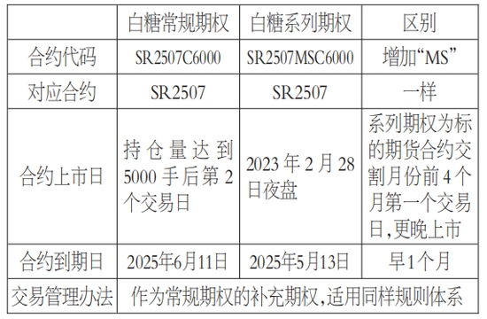 系列期權(quán)(Serial Options)或短期期權(quán),是在現(xiàn)有常規(guī)期權(quán)合約基礎(chǔ)上增掛的新合約,與常規(guī)期權(quán)都基于同一標(biāo)的期貨合約。系列期權(quán)在合約交易代碼中注明系列期權(quán)標(biāo)識(shí)MS,如以SR2507為標(biāo)的的常規(guī)期權(quán)合約代碼為SR2507C6000,而系列期權(quán)的合約代碼為SR2507MSC6000,與常規(guī)期權(quán)“插空”共存。
