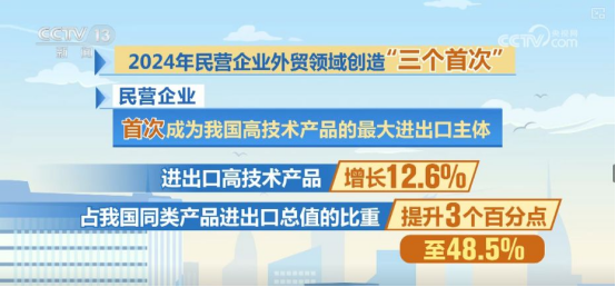 第二個首次,是民營企業(yè)首次成為我國高技術(shù)產(chǎn)品的最大進(jìn)出口主體,進(jìn)出口高技術(shù)產(chǎn)品增長12.6%,占我國同類產(chǎn)品進(jìn)出口總值的比重提升3個百分點至48.5%。