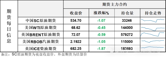 【1】WTI主力原油期貨收跌0.31美元,跌幅0.45%,報(bào)68.62美元/桶;布倫特主力原油期貨收跌0.43美元,跌幅0.59%,報(bào)72.07美元/桶;INE原油期貨收跌1.07%,報(bào)534.7元。