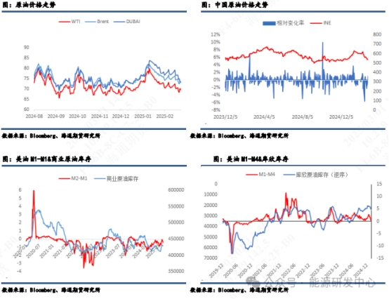 2月最后一天市場認定美國將與烏克蘭簽署礦產協(xié)議之際,在白宮橢圓形辦公室里澤林斯基與特朗普在全世界關注下上演了一出讓人瞠目結舌的激烈爭吵,最終沒有簽署協(xié)議,雙方不歡而散,這個事件對市場的影響更像是過去一段時間國際油價受到地緣擾動的一個縮影,特別是美國實施的一系列政策成為了影響油價的重要因素。這其中特朗普上任后推出的一系列讓人眼花繚亂的措施讓油價在大幅波動中持續(xù)走低。1月底2月初,美國總統(tǒng)特朗普陸續(xù)推出了對墨西哥、加拿大和中國加征關稅的政策,涉及多種商品,引發(fā)了市場的擔憂。原油市場著重關注特朗普是否將原油納入關稅清單,而加拿大是美國原油的主要進口國,加拿大和墨西哥出口到美國的原油量大約在400萬桶/天和50萬桶/天,將對美國煉廠造成較大影響。其次,這也可能會影響到美國出口商品受到反制:1)加拿大總理宣布將對價值1550億加元的美國產品加征25%的關稅;2)墨西哥總統(tǒng)也表示將采取反制措施;3)中方表示將向世貿組織提起訴訟,并將采取相應反制措施堅定維護自身權益。隨著貿易政策的變化帶來了新的險,商品市場面臨的情況變得更加復雜。