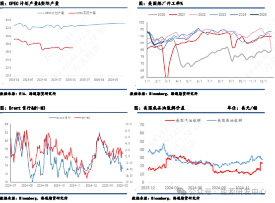 2月份原油市場基本面隨著時間推移有小幅改善的跡象,供應端來看,OPEC+有維持減產的意向,部分成員國主動減產,如尼日利亞、阿聯(lián)酋等,顯示出 OPEC+維持供應紀律的決心,在一定程度上限制了全球原油供應,避免價格因供應過剩而大幅下滑。數(shù)位OPEC+的代表也表示對石油需求增長放緩、美洲地區(qū)供應增加以及特朗普政府的關稅政策帶來的風險表示擔憂。目前原油市場的預測OPEC+仍會繼續(xù)推遲4 月開始的逐月增產計劃。需求端來看,隨著北半球冬季取暖需求高峰臨近尾聲,煉廠檢修季結束后開工率提升,煉廠原油投料增加,對油價形成階段性支撐。同時,EIA、IEA 以及 OPEC三大月報均上調了今年的全球原油需求增量,說明對全年原油需求有一定的信心,盡管增速有所放緩,但需求的增長預期對市場仍然有積極作用。從庫存來看,美國原油商業(yè)庫存在連續(xù)多周累庫后,在本周出現(xiàn)庫存超預期下降,也視為利好信號。從高頻的月差以及裂解價差來看,都沒有明顯下行甚至有上升趨勢,為油價底部帶來支撐。