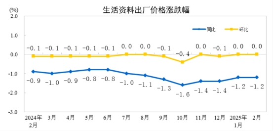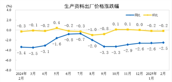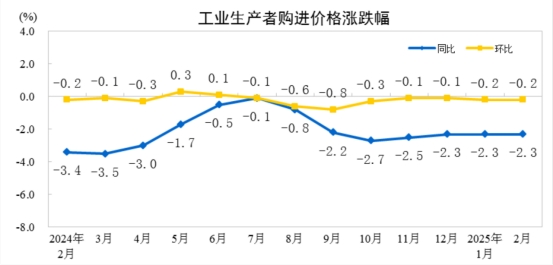 2025年2月份,全國工業(yè)生產(chǎn)者出廠價(jià)格同比下降2.2%,環(huán)比下降0.1%,降幅比上月均收窄0.1個(gè)百分點(diǎn);工業(yè)生產(chǎn)者購進(jìn)價(jià)格同比下降2.3%,環(huán)比下降0.2%。1—2月平均,工業(yè)生產(chǎn)者出廠價(jià)格比上年同期下降2.2%,工業(yè)生產(chǎn)者購進(jìn)價(jià)格下降2.3%。