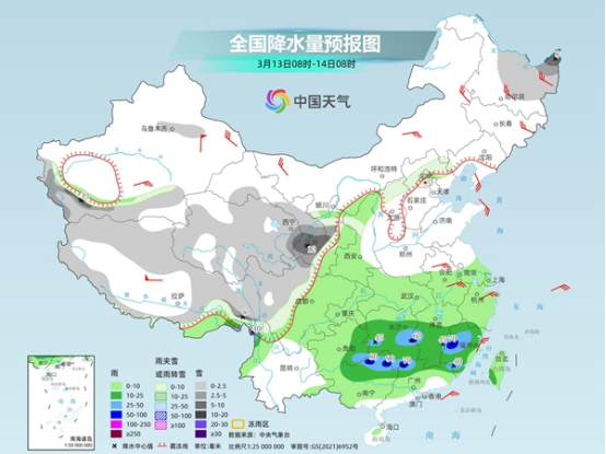 今后三天(3月13日至15日),南方大范圍降雨持續(xù),雨勢有所增強(qiáng),江南、華南部分地區(qū)需警惕強(qiáng)對流天氣,同時北方雨雪天氣也將逐漸鋪展。隨著新一股冷空氣的到來,中東部大部地區(qū)將迎來明顯降溫,各地會陸續(xù)重返偏冷的氣溫格局。