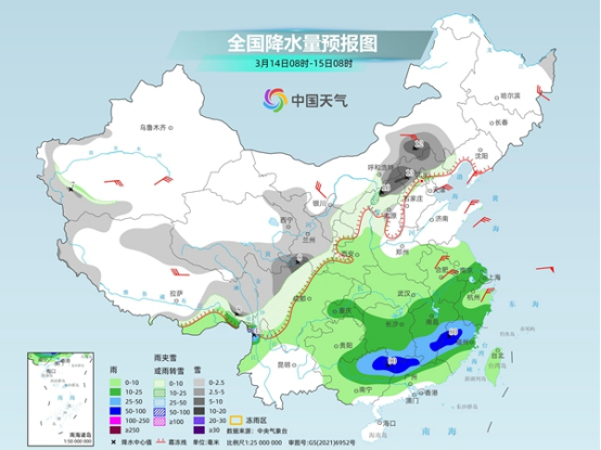 后天,內(nèi)蒙古東部、華北中北部、陜西中部、青海南部、西藏北部和東部、川西高原中北部、新疆南疆西部山區(qū)等地部分地區(qū)有小到中雪或雨夾雪,其中,內(nèi)蒙古東南部、河北北部、川西高原北部等地局部有大雪。安徽東南部、江蘇南部、浙江北部、福建大部、江西南部、廣東大部、廣西東部等地部分地區(qū)有中到大雨,其中,廣東西北部局部有暴雨。