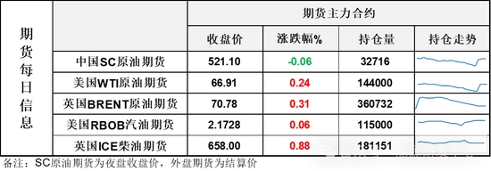 【1】WTI主力原油期貨收漲0.16美元,漲幅0.24%,報66.91美元/桶;布倫特主力原油期貨收漲0.22美元,漲幅0.31%,報70.78美元/桶;INE原油期貨收跌0.06%,報521.1元。