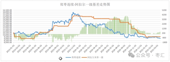 3月21日,阿拉爾灰棗一級(jí)與鄭棗期價(jià)基差為490元/噸,基差走擴(kuò)。
