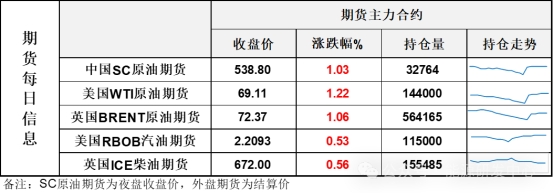 【1】WTI主力原油期貨收漲0.83美元,漲幅1.22%,報69.11美元/桶;布倫特主力原油期貨收漲0.76美元,漲幅1.06%,報72.37美元/桶;INE原油期貨收漲1.03%,報538.8元。