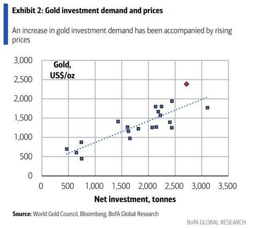 美銀的分析將黃金上漲與“投資需求的增量”掛鉤。美銀團(tuán)隊(duì)表示,其黃金定價(jià)模型考慮了礦產(chǎn)、回收、飾品需求與投資需求等多個(gè)維度。