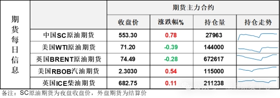 【1】WTI主力原油期貨收跌1.55美元,跌幅0.39%,報(bào)71.2美元/桶;布倫特主力原油期貨收跌0.21美元,跌幅0.28%,報(bào)74.49美元/桶;INE原油期貨收漲0.78%,報(bào)553.3元。