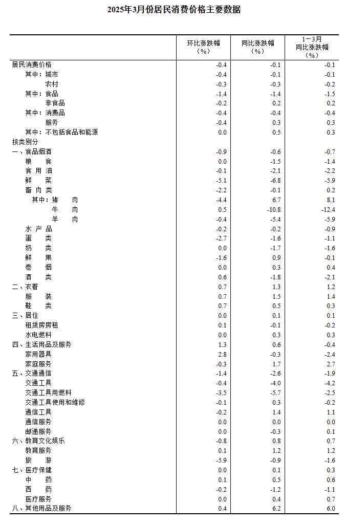2025年3月份,全國居民消費(fèi)價(jià)格同比下降0.1%。其中,城市下降0.1%,農(nóng)村下降0.3%;食品價(jià)格下降1.4%,非食品價(jià)格上漲0.2%;消費(fèi)品價(jià)格下降0.4%,服務(wù)價(jià)格上漲0.3%。1—3月平均,全國居民消費(fèi)價(jià)格比上年同期下降0.1%。