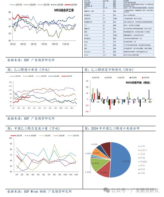 另外,國務(wù)院關(guān)稅稅則委員會4月9日發(fā)布公告,自4月10日12時01分起,對原產(chǎn)于美國的所有進口商品的加征關(guān)稅稅率由34%提高至84%。2024年我國進口美國乙二醇約占乙二醇總進口量的12.5%,且我國進口美國乙二醇的月度均值在8萬噸附近,由于此后對美國乙二醇加征84%的關(guān)稅,因此,預(yù)計將大幅縮減美國乙二醇的進口,乙二醇港口庫存有望去化,乙二醇總庫存4-5月去化幅度加大。