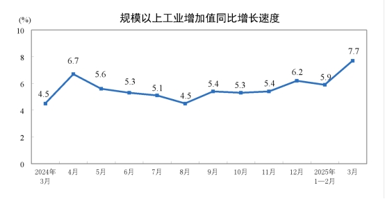 3月份,規(guī)模以上工業(yè)增加值同比實(shí)際增長7.7%(增加值增速均為扣除價(jià)格因素的實(shí)際增長率)。從環(huán)比看,3月份,規(guī)模以上工業(yè)增加值比上月增長0.44%。1—3月份,規(guī)模以上工業(yè)增加值同比增長6.5%。