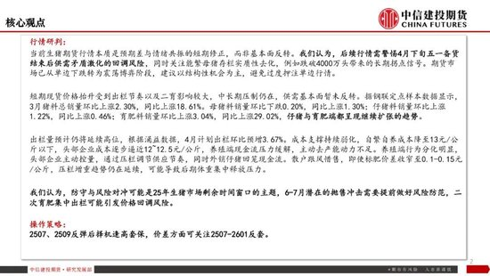 當(dāng)前生豬期貨行情本質(zhì)是預(yù)期差與情緒共振的短期修正,而非基本面反轉(zhuǎn)。我們認(rèn)為,后續(xù)行情需警惕4月下旬五一備貨結(jié)束后供需矛盾激化的回調(diào)風(fēng)險(xiǎn),同時(shí)關(guān)注能繁母豬存欄實(shí)質(zhì)性去化,例如跌破4000萬頭帶來的長期拐點(diǎn)信號(hào)。期貨市場已從單邊下跌轉(zhuǎn)為震蕩博弈階段,建議以結(jié)構(gòu)性機(jī)會(huì)為主,避免過度押注單邊行情。