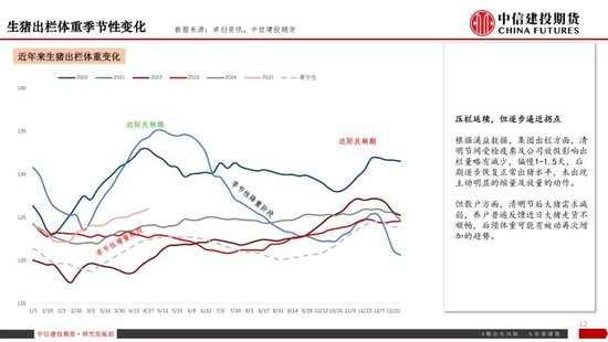 出欄量預(yù)計(jì)仍將延續(xù)高位,根據(jù)涌益數(shù)據(jù),4月計(jì)劃出欄環(huán)比預(yù)增3.67%。成本支撐持續(xù)弱化,自繁自養(yǎng)成本降至13元/公斤以下,頭部企業(yè)成本逐步逼近12~12.5元/公斤,養(yǎng)殖端現(xiàn)金流壓力緩解,主動(dòng)去產(chǎn)能動(dòng)力不足。養(yǎng)殖端行為分化明顯,頭部企業(yè)主動(dòng)控量,通過壓欄調(diào)節(jié)供應(yīng)節(jié)奏,同時(shí)外銷仔豬回籠現(xiàn)金流。散戶跟風(fēng)惜售,即使標(biāo)肥價(jià)差收窄至0.1-0.15元/公斤,壓欄增重趨勢仍在延續(xù),可能導(dǎo)致后期體重集中釋放壓力。