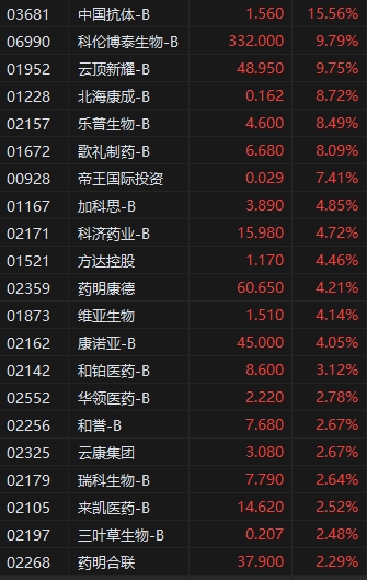 生物技術(shù)板塊持續(xù)上漲,中國抗體漲超15%,科倫博泰生物、云頂新耀漲近10%。國投證券發(fā)布研報稱,全球創(chuàng)新藥投融資環(huán)境有所復(fù)蘇,多肽、ADC等細(xì)分領(lǐng)域創(chuàng)新研發(fā)蓬勃興起,加速推動CXO行業(yè)景氣度上行,研發(fā)生產(chǎn)外包需求有望逐步改善。目前CXO上市公司相關(guān)訂單開始逐步改善且產(chǎn)能處于行業(yè)領(lǐng)先地位,看好CXO上市公司業(yè)績邊際改善。