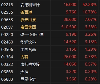 5月6日消息,港股三大指數(shù)震蕩上行,截至收盤(pán),恒生指數(shù)(22662.711, 158.03, 0.70%)漲0.70%,報(bào)22662.71點(diǎn),恒生科技指數(shù)(5239.5, -4.56, -0.09%)跌0.09%,國(guó)企指數(shù)漲0.37%。盤(pán)面上,科網(wǎng)股漲跌不一,美團(tuán)漲超4%,快手、阿里巴巴、騰訊控股(495.4, 7.60, 1.56%)漲超1%,小米集團(tuán)跌超2%;黃金股集體走強(qiáng),赤峰黃金漲超12%;稀土概念大漲,金力永磁(15.48, 1.62, 11.69%)漲超11%;非酒精飲料股多股大漲,安德利果汁(16, 5.50, 52.38%)漲近52%,茶百道漲超10%。