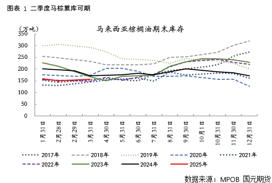 從進(jìn)口情況來看,據(jù)海關(guān)數(shù)據(jù)統(tǒng)計(jì),2025年1-2月,中國棕櫚油進(jìn)口量?jī)H為21萬噸,同比下降44.9%,3月進(jìn)口量略有回升,但仍處于20萬噸以下的低位。4月上半月,棕櫚油進(jìn)口實(shí)際裝船9.27萬噸,同比上升46.68%,但本月進(jìn)口預(yù)報(bào)裝船量?jī)H為8.01萬噸,同比下降45.40%。不過4月中旬以來,國內(nèi)棕櫚油進(jìn)口利潤(rùn)開始反彈,遠(yuǎn)月買船開始放量。截止到5月6日馬來西亞棕櫚油5月船期對(duì)盤利潤(rùn)為-104元/噸,較上周小幅下跌29.12元/噸。國內(nèi)需求相對(duì)疲弱,棕櫚油整體維持低庫運(yùn)行。據(jù)Mysteel調(diào)研顯示,截至2025年4月25日(第17周),全國重點(diǎn)地區(qū)棕櫚油商業(yè)庫存36.8萬噸,環(huán)比上周減少1.64萬噸,減幅4.27%;同比去年46.835萬噸減少10.04萬噸,減幅21.43%。