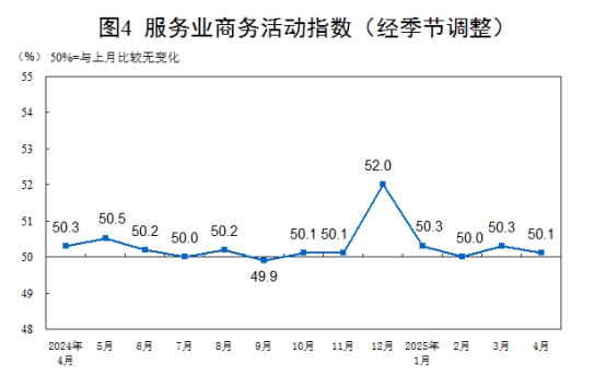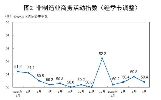 4月份,非制造業(yè)商務活動指數(shù)為50.4%,比上月下降0.4個百分點,仍高于臨界點,非制造業(yè)繼續(xù)保持擴張。