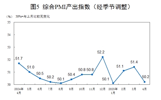 4月份,綜合PMI產(chǎn)出指數(shù)為50.2%,比上月下降1.2個百分點,繼續(xù)高于臨界點,表明我國企業(yè)生產(chǎn)經(jīng)營活動保持擴張。
