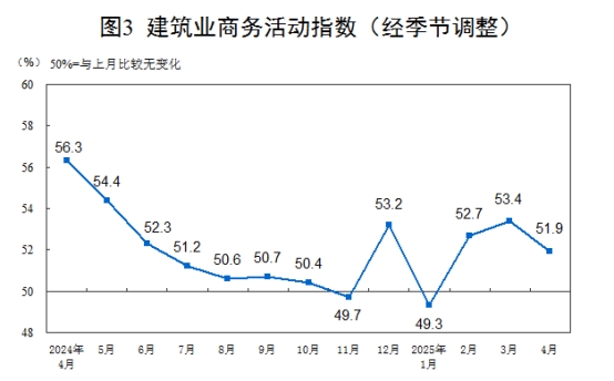 分行業(yè)看,建筑業(yè)商務活動指數(shù)為51.9%,比上月下降1.5個百分點;服務業(yè)商務活動指數(shù)為50.1%,比上月下降0.2個百分點。從行業(yè)看,航空運輸、電信廣播電視及衛(wèi)星傳輸服務、互聯(lián)網(wǎng)軟件及信息技術(shù)服務、保險等行業(yè)商務活動指數(shù)均位于55.0%以上較高景氣區(qū)間;水上運輸、資本市場服務等行業(yè)商務活動指數(shù)均低于臨界點。