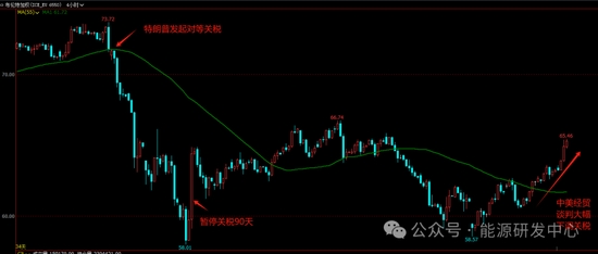 油價(jià)周一收出長上影線,盤中一度大漲超4%,早盤原油(607, -8.60, -1.40%)開盤表現(xiàn)較為謹(jǐn)慎,雖然凌晨市場(chǎng)傳出中美經(jīng)貿(mào)談判取得實(shí)質(zhì)性進(jìn)展,但因?yàn)槿狈?xì)節(jié),資金觀望為主,直到下午開盤后隨著市場(chǎng)傳出一些關(guān)于談判的積極消息,油價(jià)開始明顯走強(qiáng),等下午3點(diǎn)中美發(fā)布聯(lián)合聲明,雙方相互下調(diào)關(guān)稅力度遠(yuǎn)超預(yù)期,這大幅提振了市場(chǎng)風(fēng)險(xiǎn)偏好,油價(jià)迅速大幅沖高,不過最終油價(jià)沒有守住日內(nèi)高位,在阻力區(qū)域沖高回落回吐了大半漲幅。
