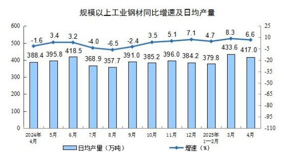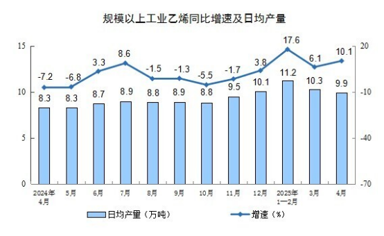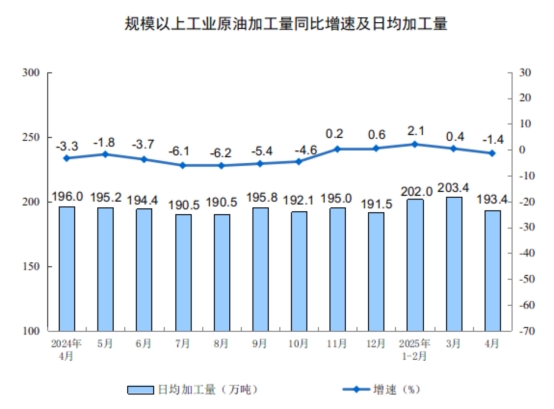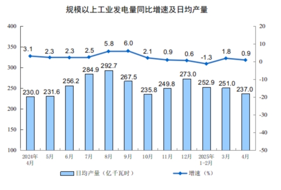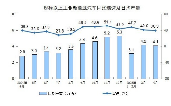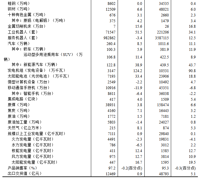分產(chǎn)品看,4月份,規(guī)模以上工業(yè)623種產(chǎn)品中有341種產(chǎn)品產(chǎn)量同比增長。其中,鋼材12509萬噸,同比增長6.6%;水泥16530萬噸,下降5.3%;十種有色金屬676萬噸,增長3.1%;乙烯298萬噸,增長10.1%;汽車260.4萬輛,增長8.5%,其中新能源汽車122.8萬輛,增長38.9%;發(fā)電量7111億千瓦時,增長0.9%;原油加工量5803萬噸,下降1.4%。