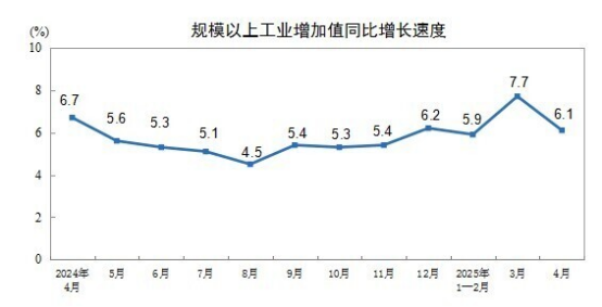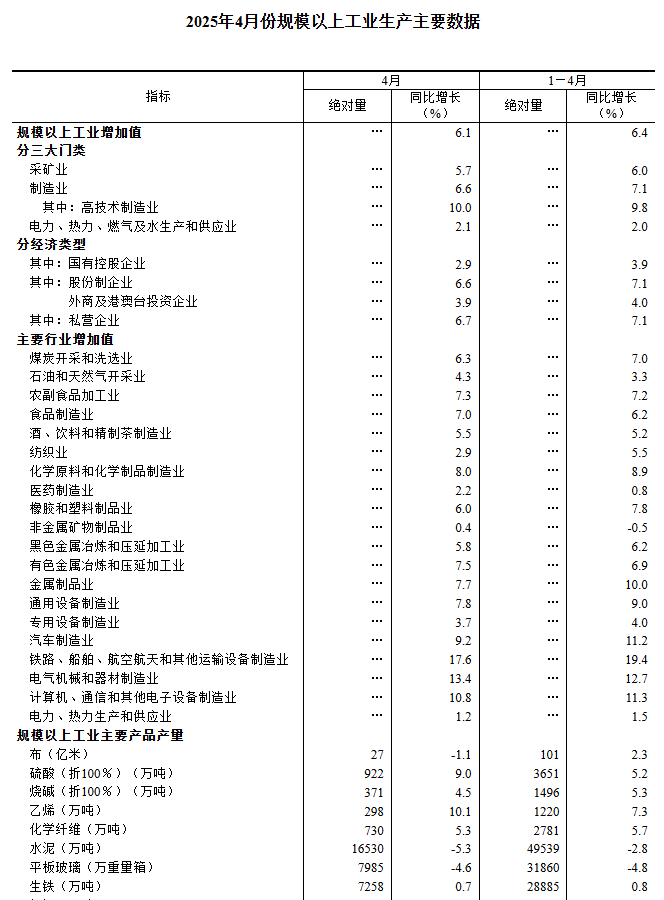 4月份,規(guī)模以上工業(yè)增加值同比實際增長6.1%(增加值增速均為扣除價格因素的實際增長率)。從環(huán)比看,4月份,規(guī)模以上工業(yè)增加值比上月增長0.22%。1—4月份,規(guī)模以上工業(yè)增加值同比增長6.4%。