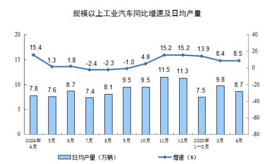 分行業(yè)看,4月份,41個大類行業(yè)中有36個行業(yè)增加值保持同比增長。其中,煤炭開采和洗選業(yè)增長6.3%,石油和天然氣開采業(yè)增長4.3%,農(nóng)副食品加工業(yè)增長7.3%,酒、飲料和精制茶制造業(yè)增長5.5%,紡織業(yè)增長2.9%,化學(xué)原料和化學(xué)制品制造業(yè)增長8.0%,非金屬礦物制品業(yè)增長0.4%,黑色金屬冶煉和壓延加工業(yè)增長5.8%,有色金屬冶煉和壓延加工業(yè)增長7.5%,通用設(shè)備制造業(yè)增長7.8%,專用設(shè)備制造業(yè)增長3.7%,汽車制造業(yè)增長9.2%,鐵路、船舶、航空航天和其他運輸設(shè)備制造業(yè)增長17.6%,電氣機械和器材制造業(yè)增長13.4%,計算機、通信和其他電子設(shè)備制造業(yè)增長10.8%,電力、熱力生產(chǎn)和供應(yīng)業(yè)增長1.2%。