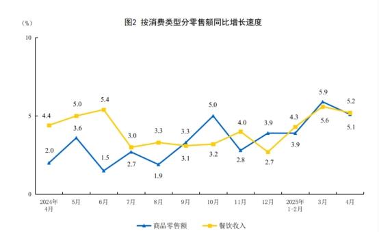 2025年4月份社會消費(fèi)品零售總額增長5.1%