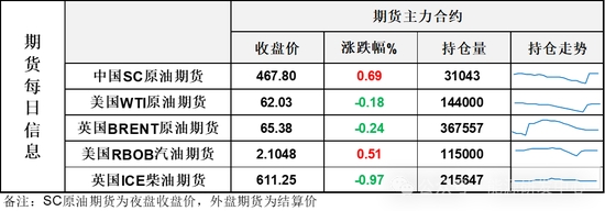 【1】WTI主力原油期貨收跌0.11美元,跌幅0.18%,報62.03美元/桶;布倫特主力原油期貨收跌0.16美元,跌幅0.24%,報65.38美元/桶;INE原油期貨收漲0.69%,報467.8元。