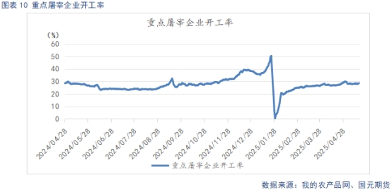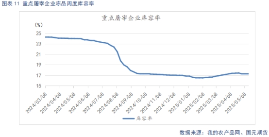 截止5月20日,重點屠宰企業(yè)開工率為28.51%,較上周回升0.51%。冷凍肉庫容率17.28%,較上周環(huán)比上升0.01%。五一過后,節(jié)日效應(yīng)淡化,加之天氣逐步轉(zhuǎn)熱,終端需求回落,屠企開工率下滑。近期在端午節(jié)前夕的備貨需求推動下,開工率小幅回升。整體來看,需求表現(xiàn)偏弱,開工率窄幅波動。當(dāng)前市場凍肉需求疲弱,出庫偏緩,且部分屠企因鮮肉銷售不暢,存在被動入庫的現(xiàn)象,近期凍肉庫存小幅增加。