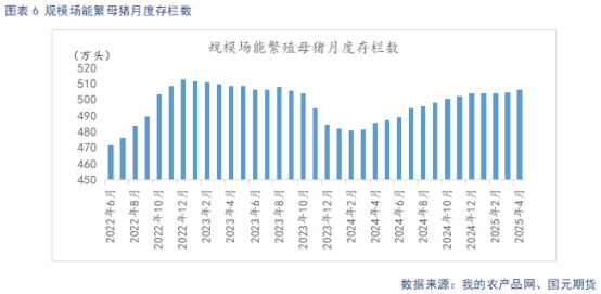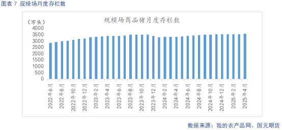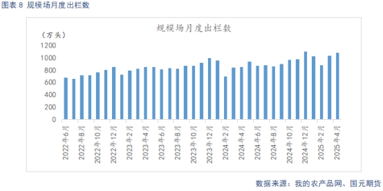 據(jù)Mysteel統(tǒng)計,截止2025年4月底,規(guī)模場能繁母豬存欄量為506.68萬頭,環(huán)比上調(diào)0.36%,同比增長4.31%。4月豬價平穩(wěn)運行,養(yǎng)殖端仍有一定利潤空間,去產(chǎn)能意愿不強,能繁母豬存欄延續(xù)增長趨勢。自24年4月起,養(yǎng)殖利潤回暖支撐下,規(guī)模場產(chǎn)能逐步回升,從生產(chǎn)周期推算,2025年規(guī)模場理論產(chǎn)能呈現(xiàn)環(huán)比上升態(tài)勢。規(guī)模場4月商品豬存欄數(shù)為3548.24萬頭,環(huán)比增加0.1%,同比增加6.28%。規(guī)模場4月商品豬出欄量為1085.65萬頭,環(huán)比增加4.46%,同比增加26.58%。4月標(biāo)肥價差逐步縮窄,大豬價格優(yōu)勢不再,認(rèn)賣情緒升溫,規(guī)模場完成當(dāng)月出欄計劃。5月,前期壓欄、二育豬源陸集中出欄壓力較大,出欄量有望延續(xù)增長。