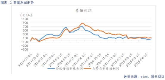 截止5月16日,自繁自養(yǎng)養(yǎng)殖盈利122.23元/頭,盈利較上周環(huán)比擴大8.73元/頭。外購仔豬養(yǎng)殖盈利56.69元/頭,盈利較上周擴大24.99元/頭。豬價近期小幅走弱,不過豆粕價格持續(xù)回調(diào),飼料成本整體回落,養(yǎng)殖端利潤有所回升。